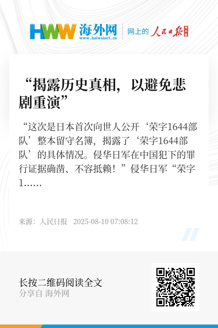 “这次是日本首次向世人公开‘荣字1644部队’整本留守名簿,揭露了‘荣字1644部队’的具体情况。侵华日军在中国犯下的罪行证据确凿、不容抵赖!”侵华日军“荣字1644部队”队员后代、77岁老人竹上胜利近日在接受本报记者采访时表示。