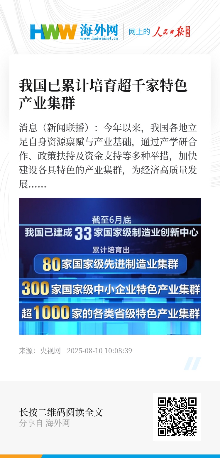 央视网消息(新闻联播):今年以来,我国各地立足自身资源禀赋与产业基础,通过产学研合作、政策扶持及资金支持等多种举措,加快建设各具特色的产业集群,为经济高质量发展注入强劲动力。