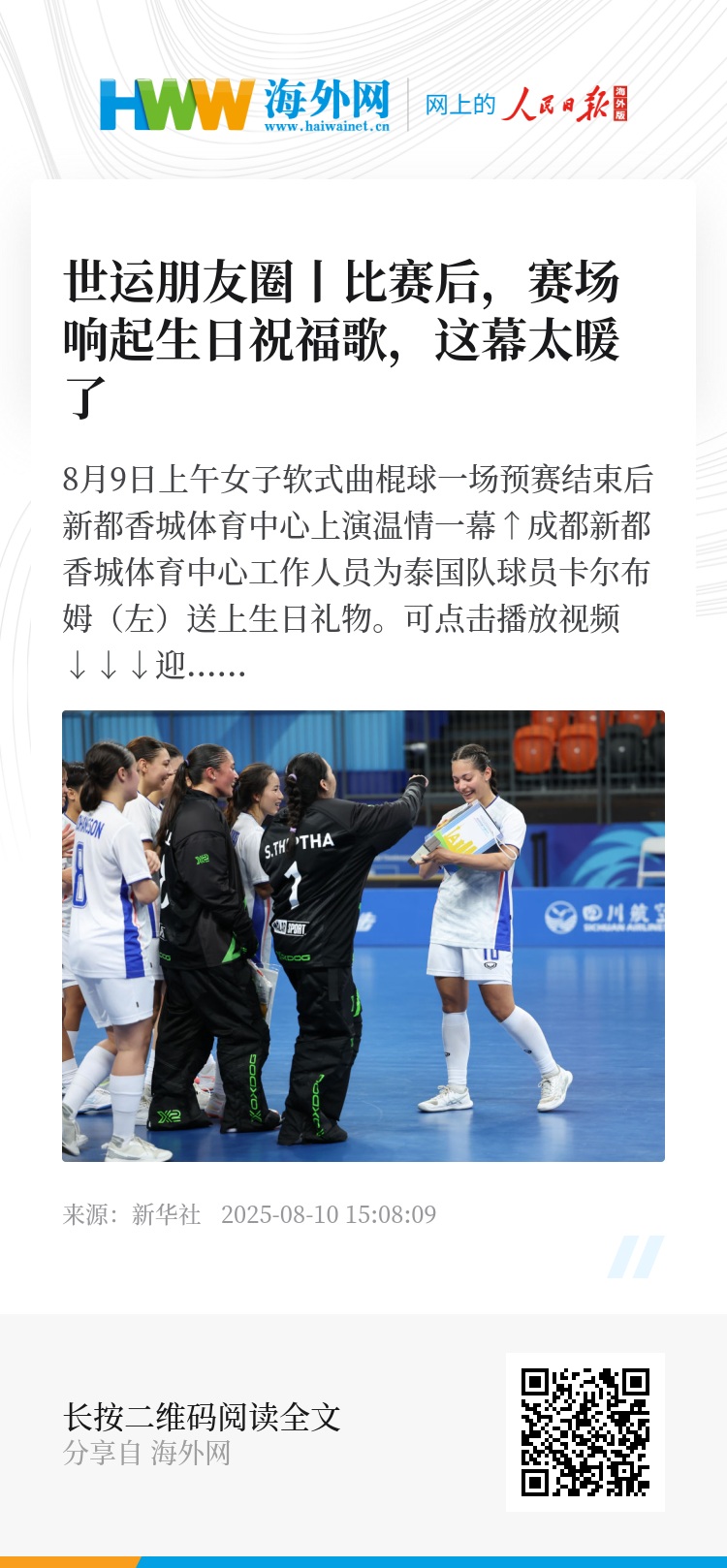 ↑泰国队成员在成都世运会软式曲棍球女子A组预赛后合影。