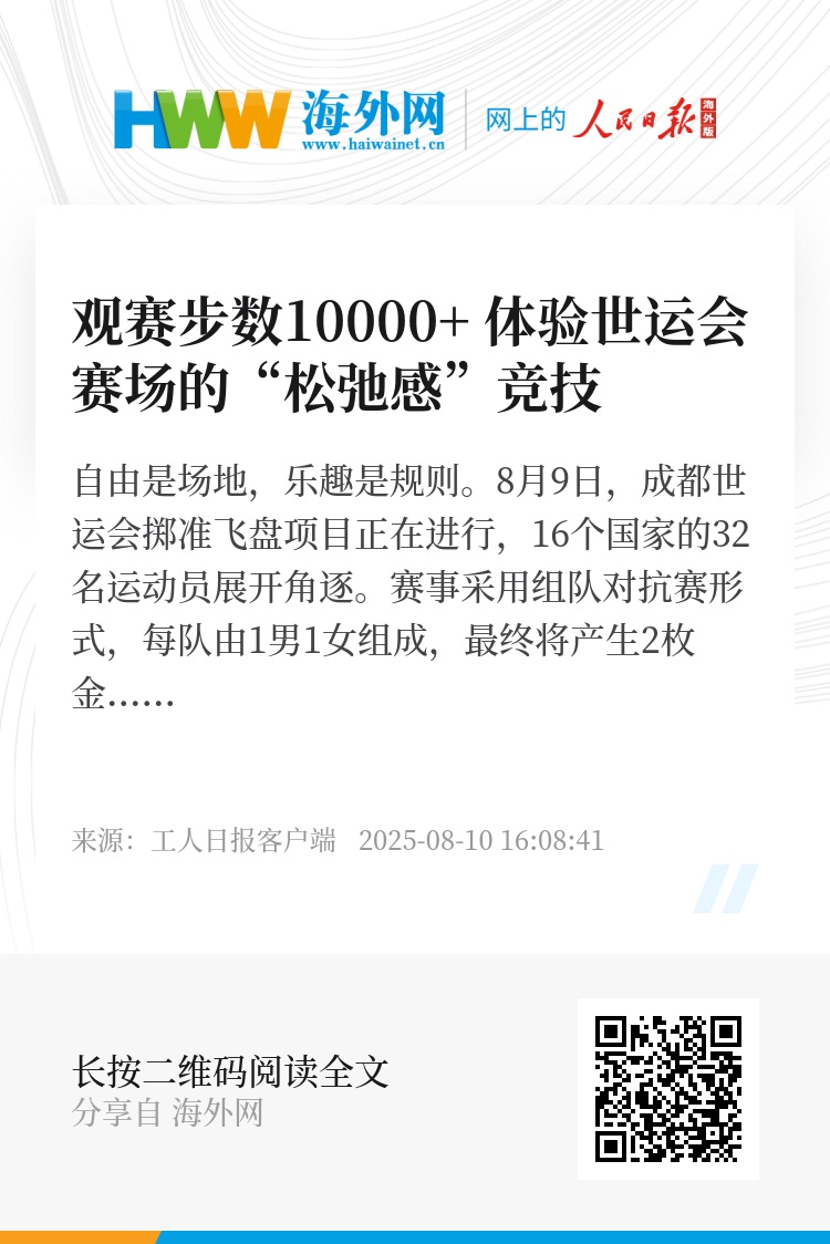 自由是场地,乐趣是规则。8月9日,成都世运会掷准飞盘项目正在进行,16个国家的32名运动员展开角逐。赛事采用组队对抗赛形式,每队由1男1女组成,最终将产生2枚金牌。