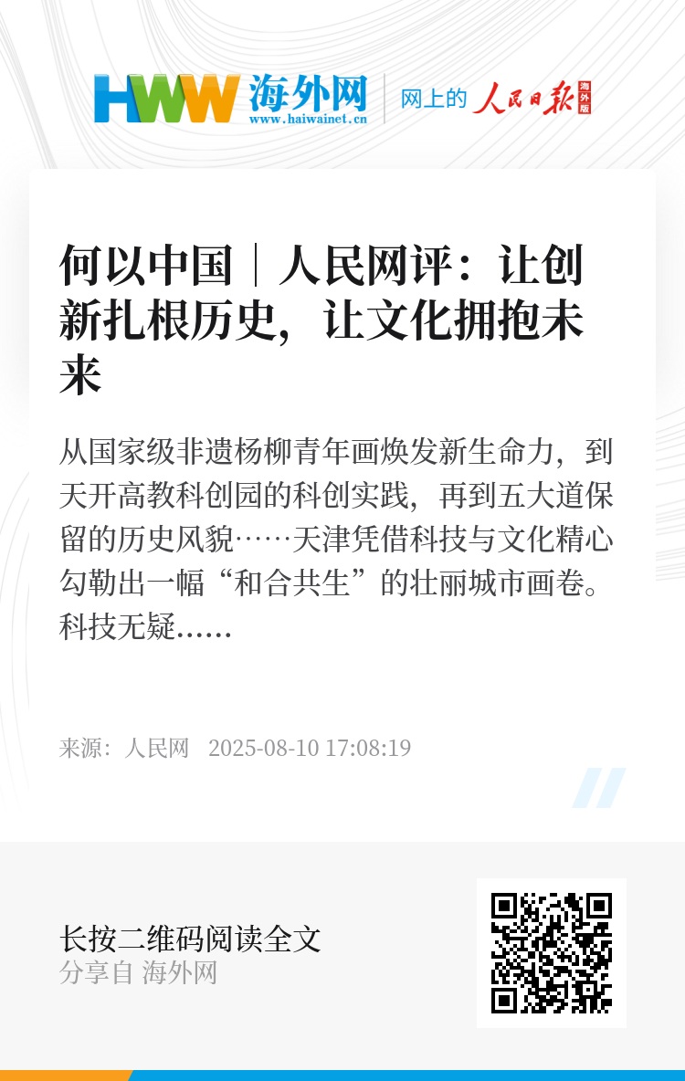从国家级非遗杨柳青年画焕发新生命力,到天开高教科创园的科创实践,再到五大道保留的历史风貌……天津凭借科技与文化精心勾勒出一幅“和合共生”的壮丽城市画卷。
