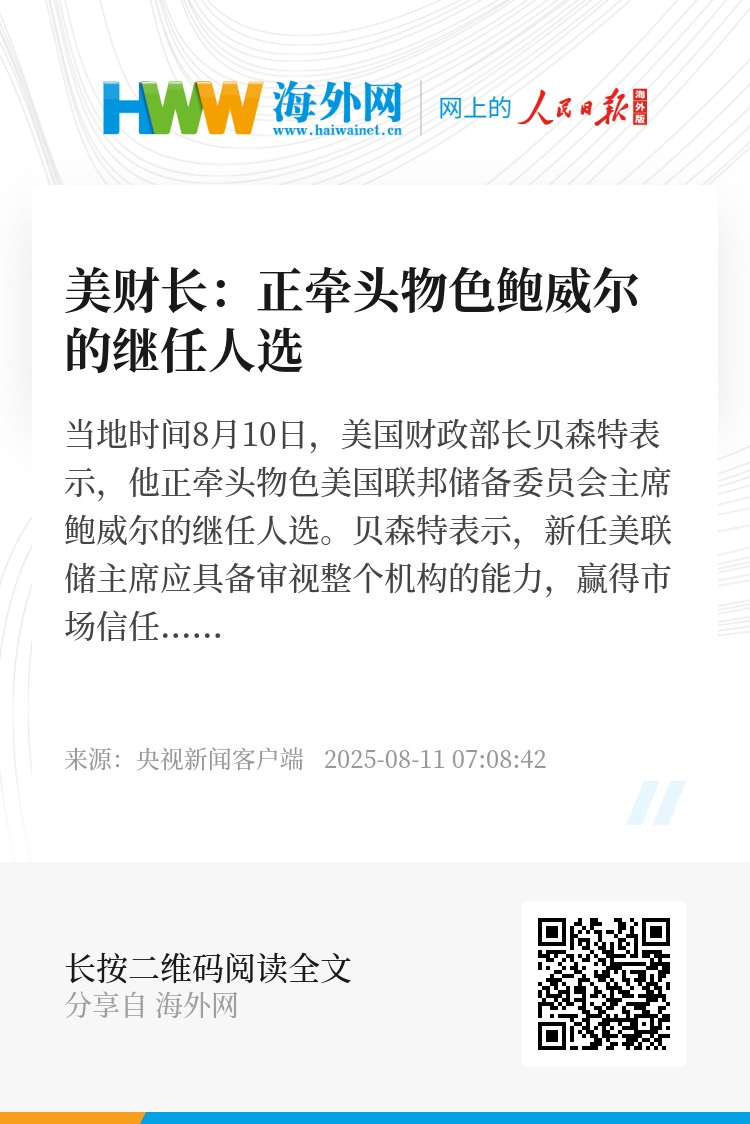 当地时间8月10日,美国财政部长贝森特表示,他正牵头物色美国联邦储备委员会主席鲍威尔的继任人选。