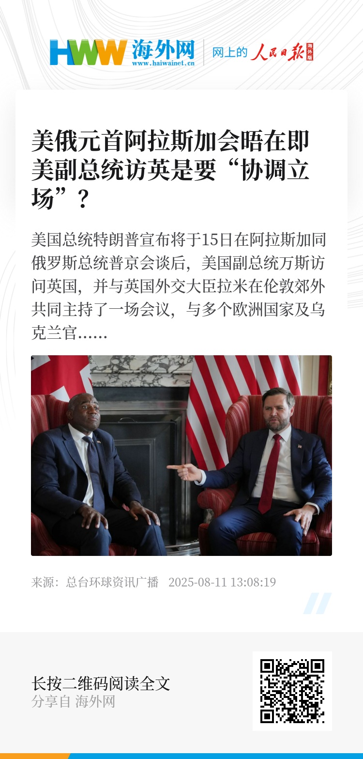 美国总统特朗普宣布将于15日在阿拉斯加同俄罗斯总统普京会谈后,美国副总统万斯访问英国,并与英国外交大臣拉米在伦敦郊外共同主持了一场会议,与多个欧洲国家及乌克兰官员讨论乌克兰危机。