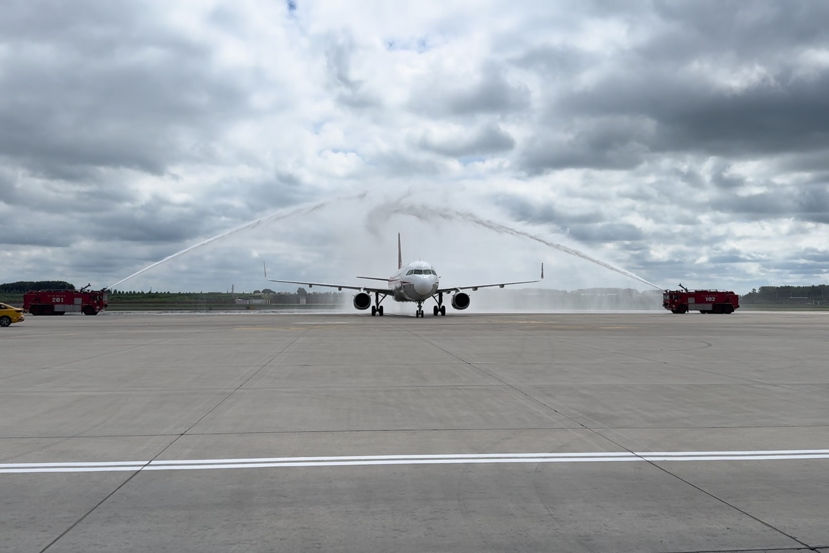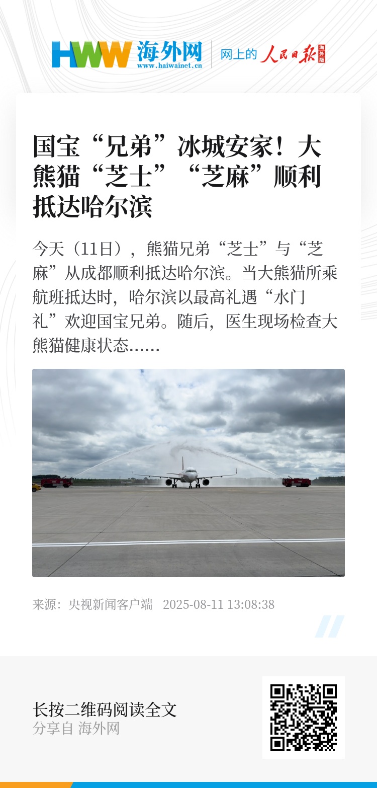 当大熊猫所乘航班抵达时,哈尔滨以最高礼遇“水门礼”欢迎国宝兄弟。