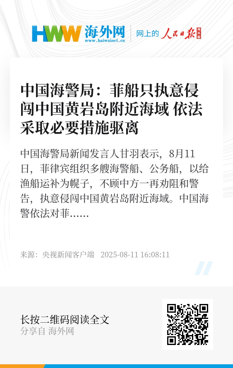 中国海警局新闻发言人甘羽表示,8月11日,菲律宾组织多艘海警船、公务船,以给渔船运补为幌子,不顾中方一再劝阻和警告,执意侵闯中国黄岩岛附近海域。中国海警依法对菲船采取跟监外逼、拦阻管制等必要措施予以驱离,现场操作专业规范、正当合法。黄岩岛是中国固有领土。中国海警将依法在黄岩岛海域开展维权执法活动,坚决维护国家领土主权和海洋权益。