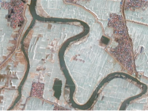 这是在卫星多时相云图上看到的当代漳卫汇合景象。大雪覆盖了徐万仓的田野与堤岸。凸显出左侧的漳河比右侧的卫河明显细小了许多,形象地显示了漳河在不同时期的济运、补水功能。据《三国志》记载,早在公元213年,曹操凿利漕渠,就引漳水入白沟,将漳、卫、黄三河联通起来。
