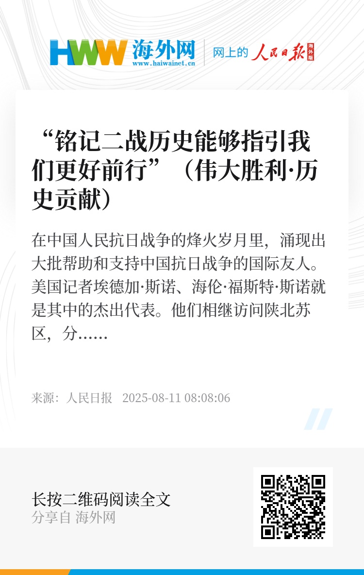 在纪念中国人民抗日战争暨世界反法西斯战争胜利80周年之际,海伦·福斯特·斯诺的侄孙、美国海伦·福斯特·斯诺基金会主席亚当·福斯特接受本报记者采访,回溯先辈支持正义战争、声援世界和平、增进美中友谊的故事。他表示:“正如海伦常常提到的,和平源于各国人民之间的相互理解与尊重。我们相信,铭记二战历史能够指引我们更好前行。”