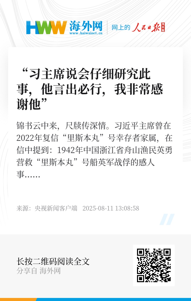 锦书云中来,尺牍传深情。习近平主席曾在2022年复信“里斯本丸”号幸存者家属,在信中提到:1942年中国浙江省舟山渔民英勇营救“里斯本丸”号船英军战俘的感人事迹,是中英在第二次世界大战中作为盟友并肩作战、共同抗击法西斯侵略的重要见证,也是两国人民结下深厚情谊的历史佳话。