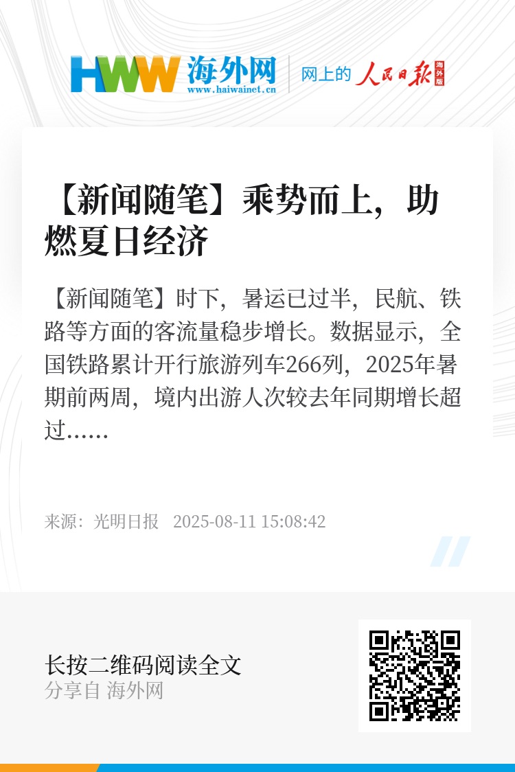 时下,暑运已过半,民航、铁路等方面的客流量稳步增长。数据显示,全国铁路累计开行旅游列车266列,2025年暑期前两周,境内出游人次较去年同期增长超过30%。不断上扬的出游数据,勾勒出夏日经济火爆的发展态势。从繁华夜市到消暑家电,从异彩纷呈的文旅活动到多元丰富的研学之旅,夏日经济作为一种相对成熟的季节型经济,不断呈现出新气象。