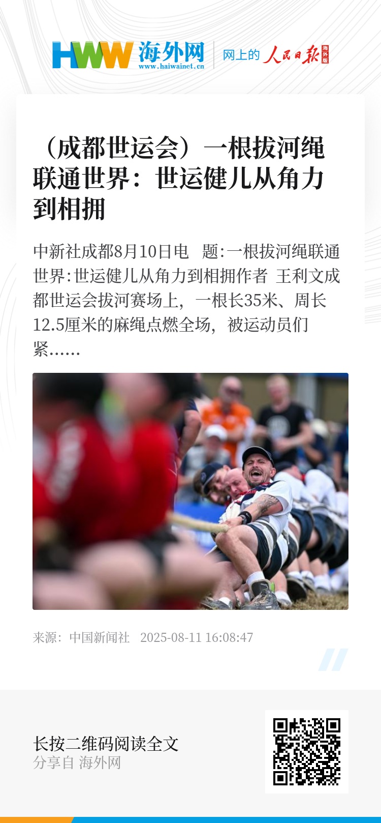 成都世运会拔河赛场上,一根长35米、周长12.5厘米的麻绳点燃全场,被运动员们紧紧攥住。当哨声响起,绳索不仅是两端力量的碰撞,更成为交心的桥梁,联通的是竞技,也是团结。