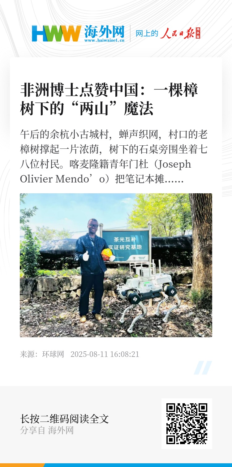 午后的余杭小古城村,蝉声织网,村口的老樟树撑起一片浓荫,树下的石桌旁围坐着七八位村民。喀麦隆籍青年门杜(Joseph Olivier Mendo’o)把笔记本摊在膝上,听着国网杭州员工向村民们解释,不再需要砍树,用套管解决村头日益茂盛的大树与输电线之间的矛盾时。门杜忍不住用中文感叹:“我明白了,这就是绿水青山就是金山银山!”