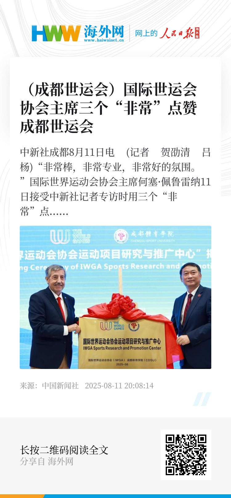 中新社成都8月11日电 (记者 贺劭清 吕杨)“非常棒,非常专业,非常好的氛围。”国际世界运动会协会主席何塞·佩鲁雷纳11日接受中新社记者专访时用三个“非常”点赞成都世运会。