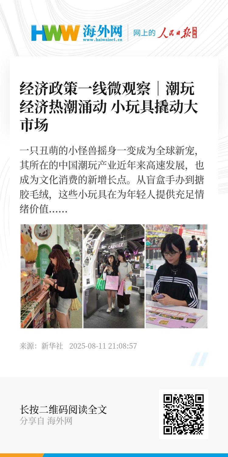 位于上海市南京路步行街的一家潮玩店总是人流涌动,年轻人排队抢购自己心仪的潮玩IP盲盒。相关财报显示,2024年该公司实现营收130.4亿元,同比增长106.9%。年轻人纷纷加入中国原创潮流IP的“粉丝圈”,带火消费热度。