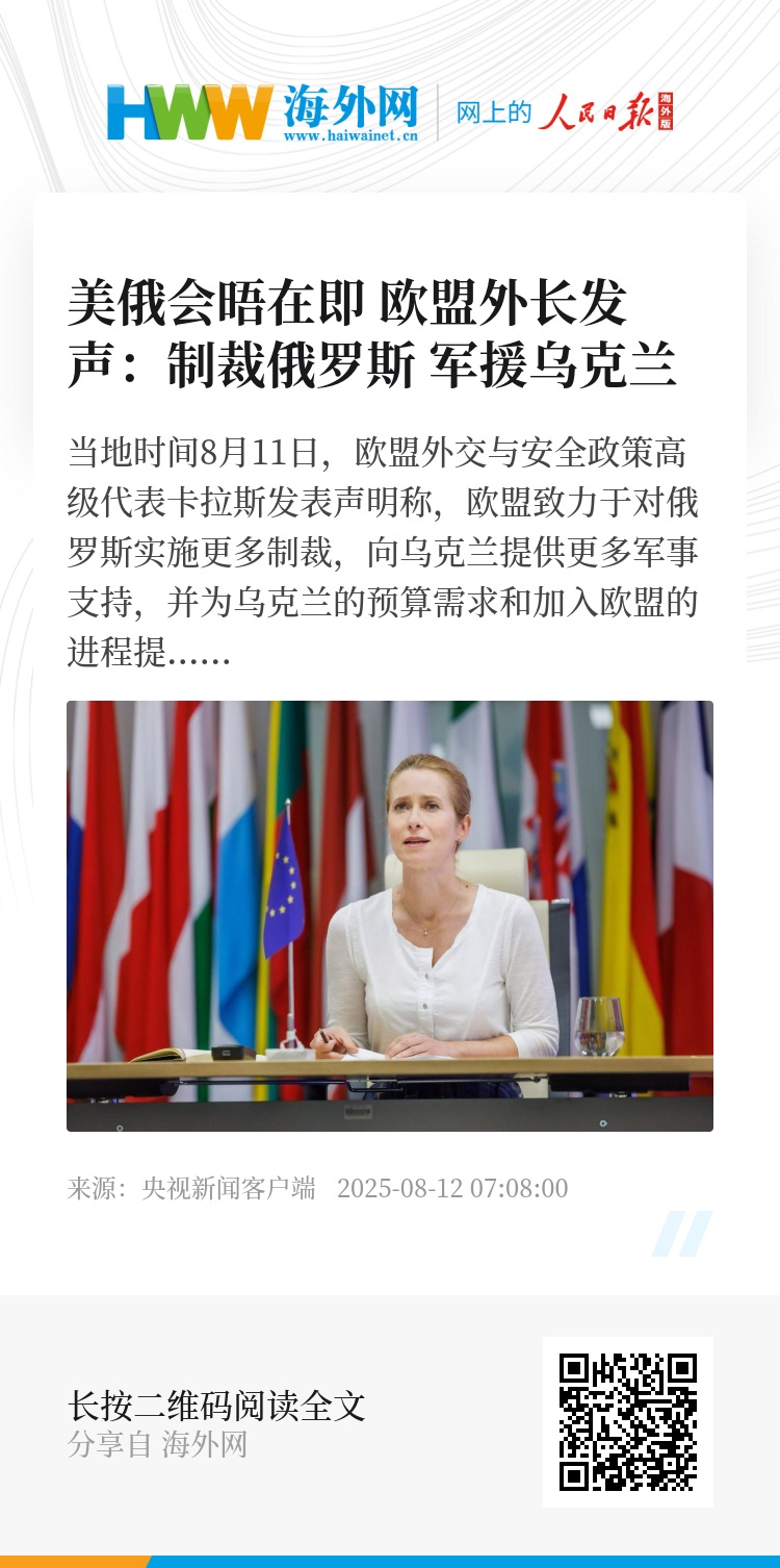 当地时间8月11日,欧盟外交与安全政策高级代表卡拉斯发表声明称,欧盟致力于对俄罗斯实施更多制裁,向乌克兰提供更多军事支持,并为乌克兰的预算需求和加入欧盟的进程提供支持。