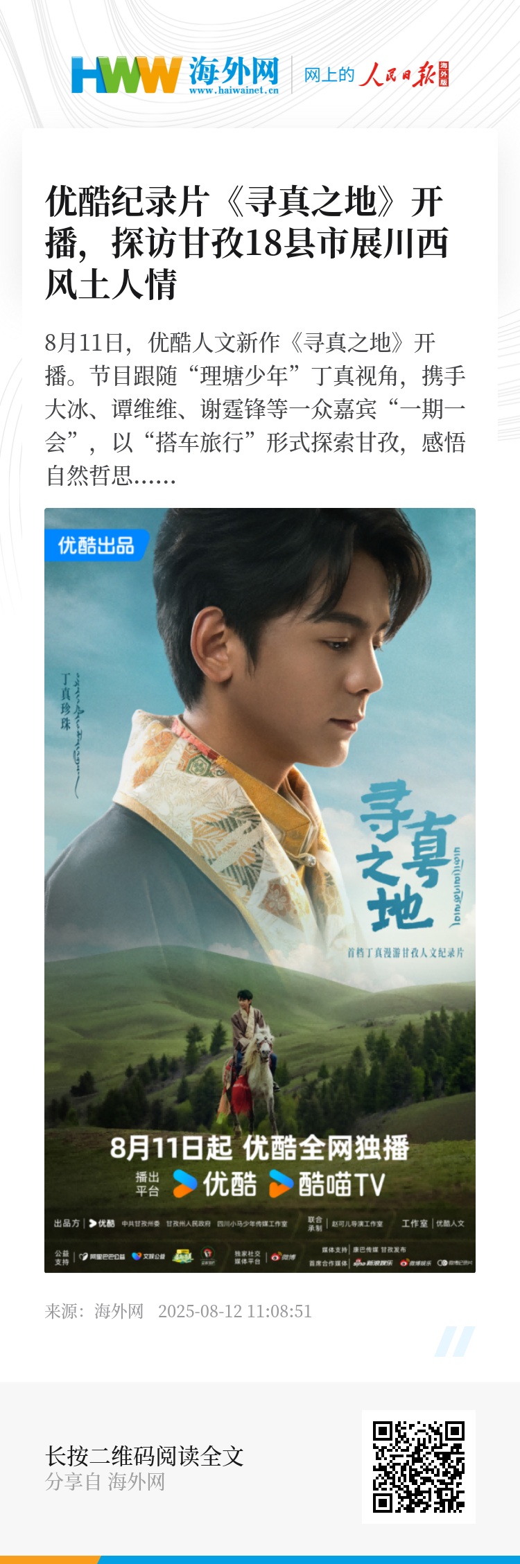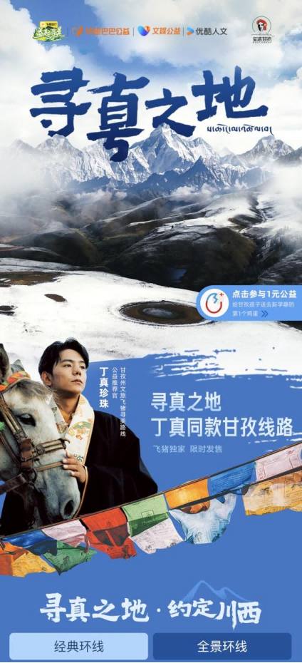 8月11日,优酷人文新作《寻真之地》开播。节目跟随“理塘少年”丁真视角,携手大冰、谭维维、谢霆锋等一众嘉宾“一期一会”,以“搭车旅行”形式探索甘孜,感悟自然哲思。该片也是继《丁真的自然笔记》播出四年后,丁真又一次久违的“家乡回归”之旅。播出当日,飞猪旅游亦同步上线“寻真之旅·约定川西”丁真同款甘孜线路。