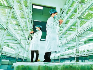 甘肃省张掖市山丹县近年来全力打造马铃薯种薯繁育体系。图为山丹县天润薯业同培黎学院校企合作马铃薯研发中心育苗室内,工作人员在观察脱毒马铃薯组培苗的生长情况。王将摄(人民视觉)