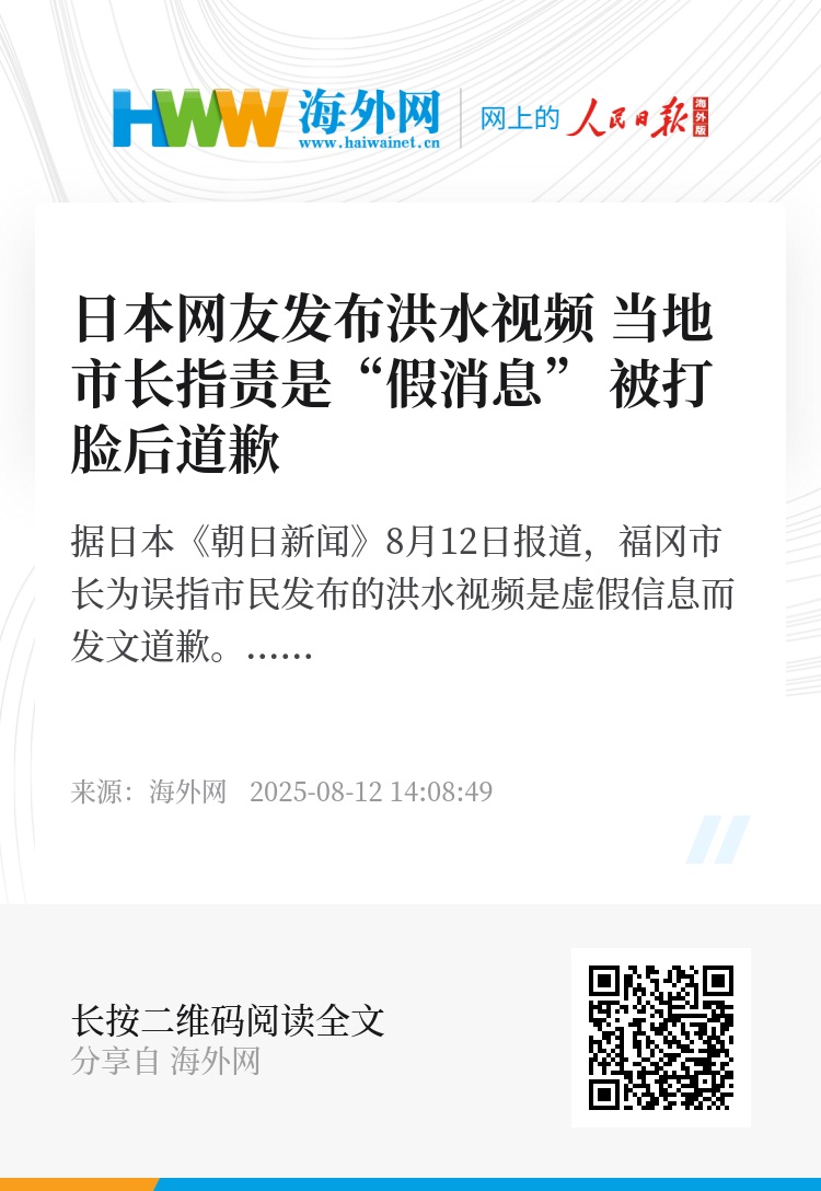 海外网8月12日电 据日本《朝日新闻》8月12日报道,福冈市长为误指市民发布的洪水视频是虚假信息而发文道歉。