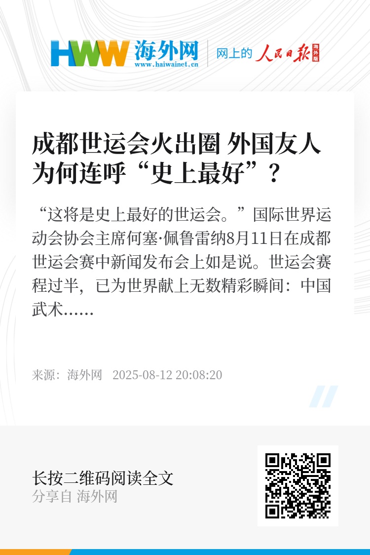 成都世运会,如同一扇精心开启、流光溢彩的窗口。透过它,世界清晰地看到了一个立体的中国:这里有五千年文明长河沉淀的深厚底蕴;这里有现代都市蓬勃发展的开放活力和“安逸”“巴适”的城市生活美学;这里更有直抵人心、令人动容的人文温度。成都以其最真挚的城市热情和独特的文化魅力向世界宣告:中国人不仅能在竞技赛场上追求“更快、更高、更强”,更能在赛场之外展现温暖包容的大国风范,让全球宾客沉浸式体验中华文化的博大精深,感受了东道主无微不至的用心,更触摸到了中国人民发自内心的善良与真诚。中国,正以更加开放、自信、温暖的姿态,欢迎世界各地的朋友前来,共同感受这份独一无二的“底蕴与热情”。(海外网 张霓)