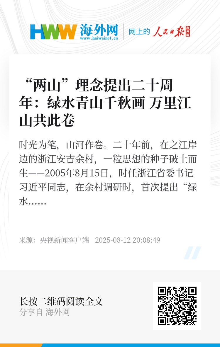 时光为笔,山河作卷。二十年前,在之江岸边的浙江安吉余村,一粒思想的种子破土而生——2005年8月15日,时任浙江省委书记习近平同志,在余村调研时,首次提出“绿水青山就是金山银山”这一充满前瞻性的理念。