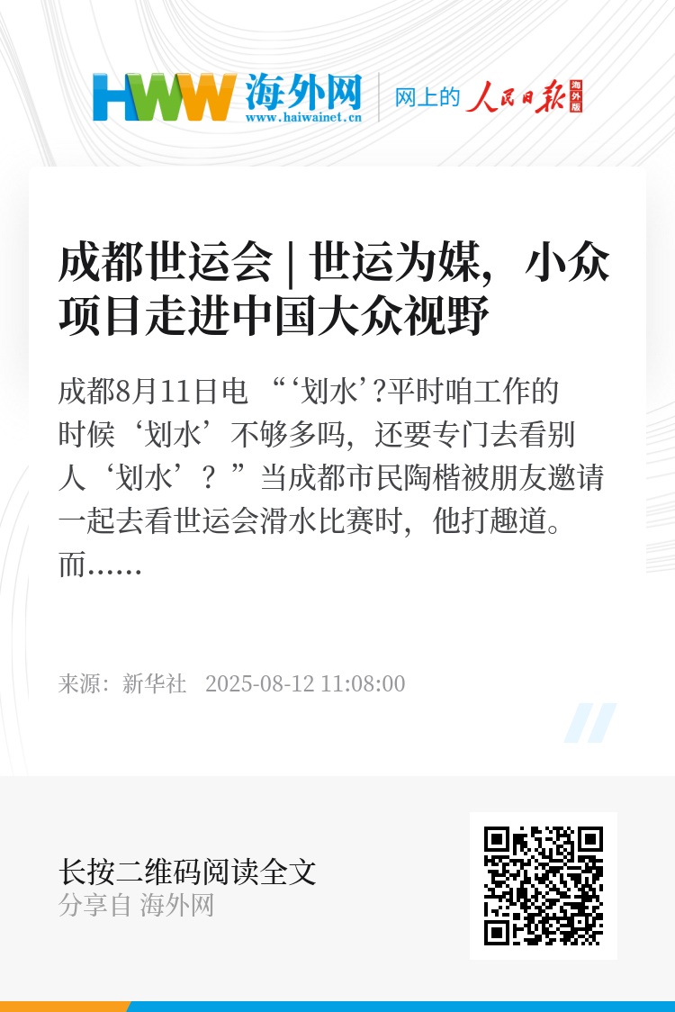 新华社成都8月11日电 “‘划水’?平时咱工作的时候‘划水’不够多吗,还要专门去看别人‘划水’?”当成都市民陶楷被朋友邀请一起去看世运会滑水比赛时,他打趣道。