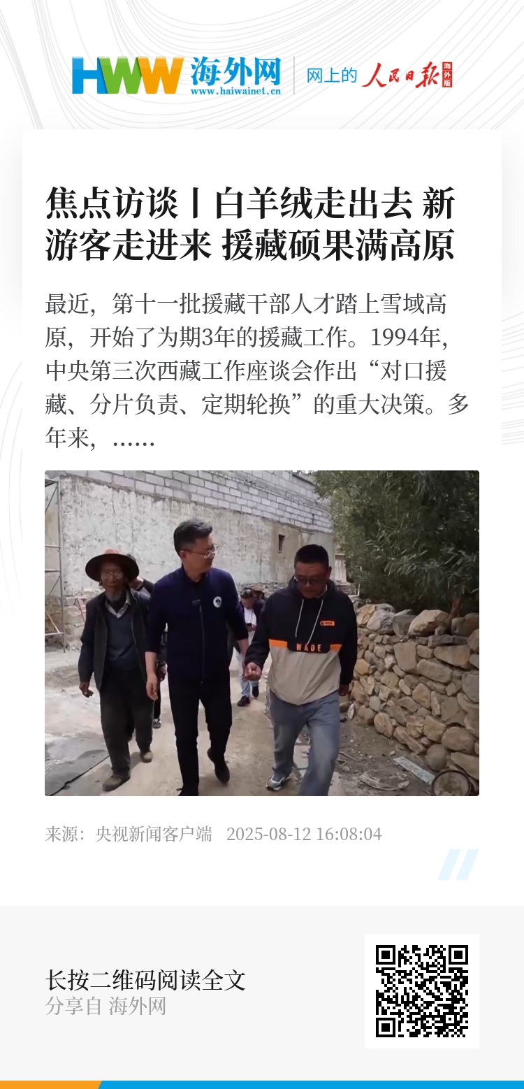 对口援藏政策实施以来,为西藏产业发展注入了强劲动力。这些援藏项目中,有的填补了西藏的产业空白,有的对传统产业进行改造升级,与此同时,西藏内生动力不断增强。党的十八大以来,西藏地区多项主要经济指标增速多年位居全国前列。2024年,西藏地区生产总值达到2765亿元,今年有望突破3000亿元。扎根世界屋脊、建功雪域高原。一批批援藏干部人才和当地干部群众携手同心,以实际行动,正不断推动西藏长治久安和高质量发展。