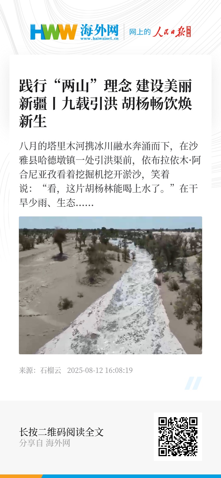 今年,塔河流域全年计划引洪补水6.52亿立方米,将灌溉喀什地区、阿克苏地区、和田地区、巴音郭楞蒙古自治州等多地的胡杨林区。这条沙漠前沿以水为盾、以绿为墙的生态防线建设,正成为“绿水青山就是金山银山”理念在死亡之海边缘的生动实践。(石榴云/新疆日报记者 康颢严)