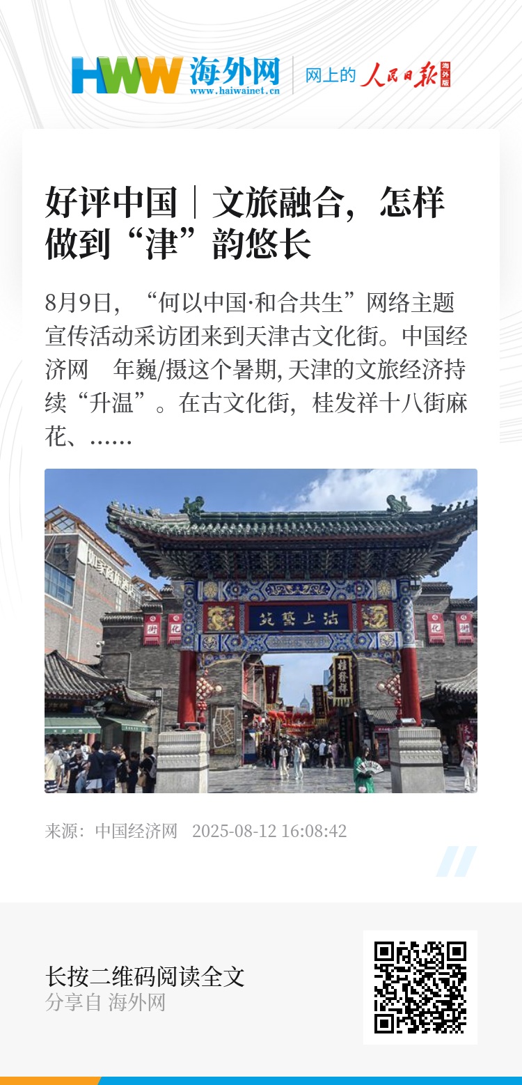 流动的经济社会图景里,处处洋溢着独特的“中国风”“文化味”。今年以来,一系列政策陆续出台。《关于进一步培育新增长点繁荣文化和旅游消费的若干措施》围绕六个方面,提出18项具体措施。《提振消费专项行动方案》提出,“扩大文体旅游消费”。数据显示,今年上半年,天津共接待国内游客13483.88万人次,同比增长3.9%;国内游客旅游花费1437.61亿元,同比增长12.1%。