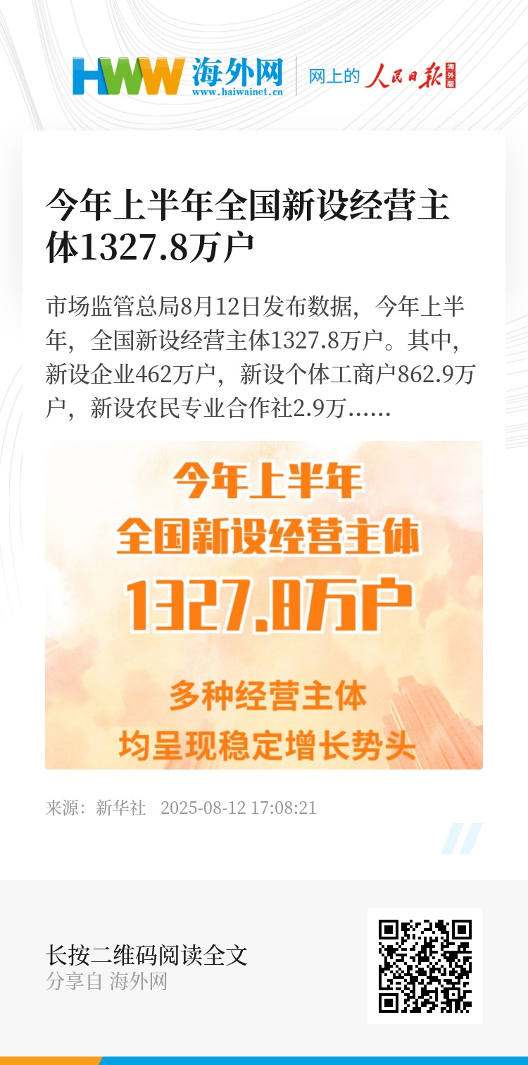 市场监管总局8月12日发布数据,今年上半年,全国新设经营主体1327.8万户。其中,新设企业462万户,新设个体工商户862.9万户,新设农民专业合作社2.9万户,多种经营主体均呈现稳定增长势头。