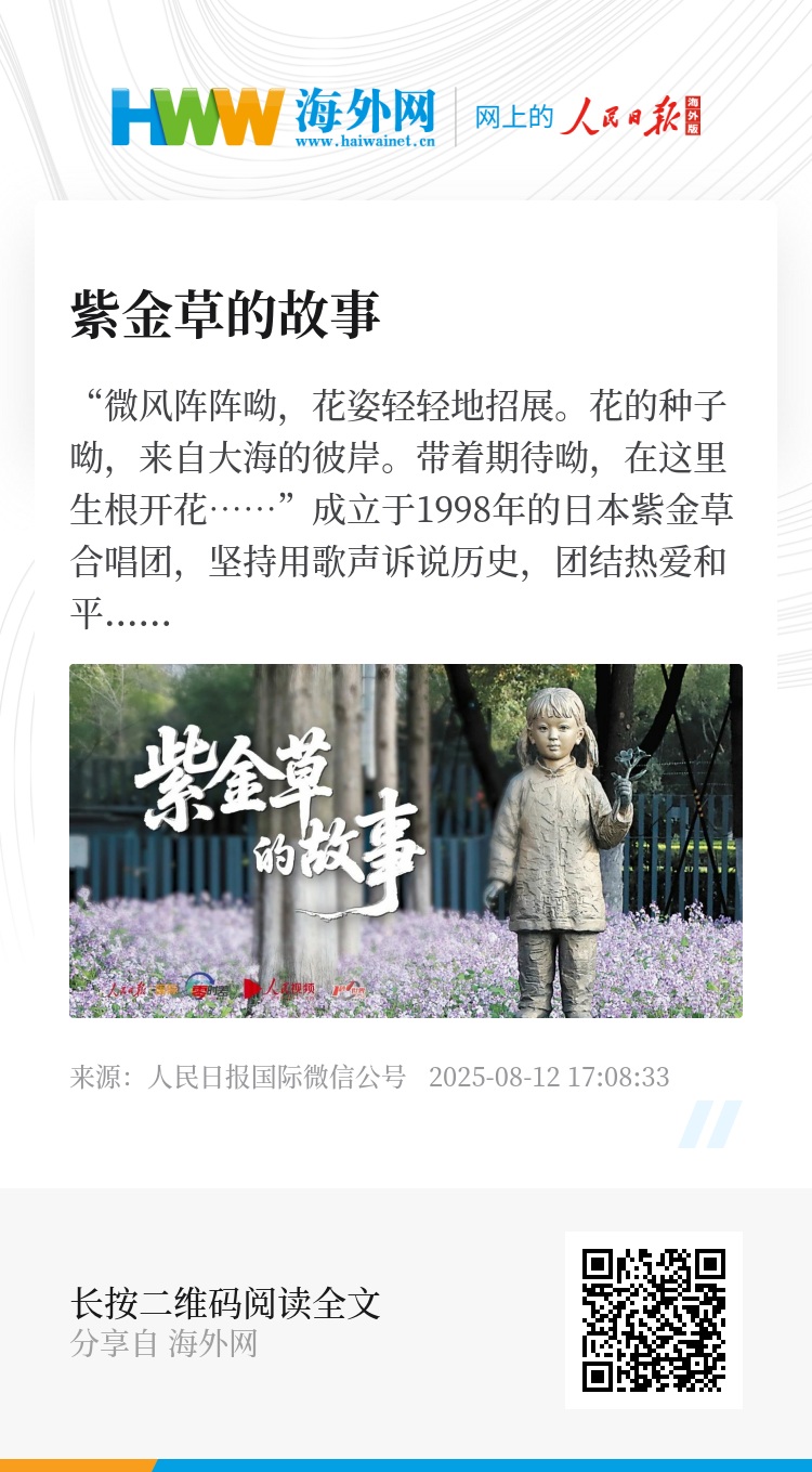 “微风阵阵呦,花姿轻轻地招展。花的种子呦,来自大海的彼岸。带着期待呦,在这里生根开花……”成立于1998年的日本紫金草合唱团,坚持用歌声诉说历史,团结热爱和平、反对战争的正义人士,共同守护未来。