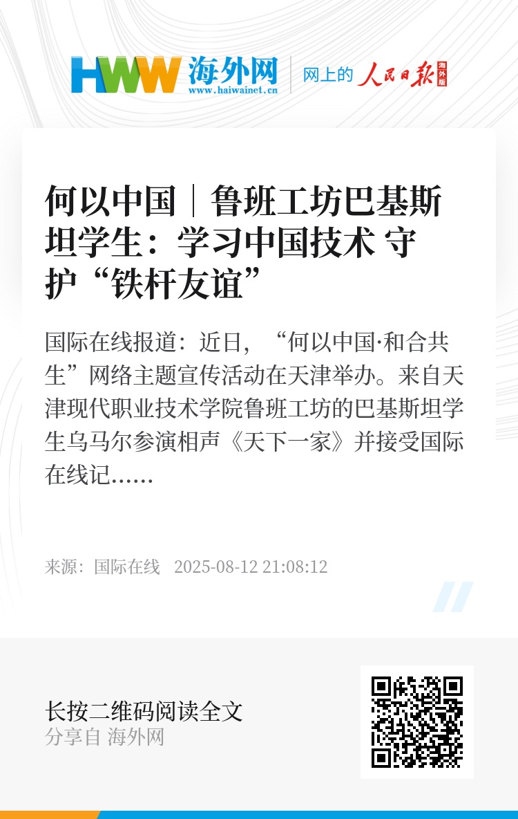 国际在线报道:近日,“何以中国·和合共生”网络主题宣传活动在天津举办。来自天津现代职业技术学院鲁班工坊的巴基斯坦学生乌马尔参演相声《天下一家》并接受国际在线记者专访。乌马尔表示,他已深深爱上中国文化,也切实感受到中巴之间的“铁杆”友谊。他期待未来能够有更多巴基斯坦青年来到中国,体验中国文化、学习中国先进技术,为促进中巴青年交流添砖加瓦。(胡晓薇)