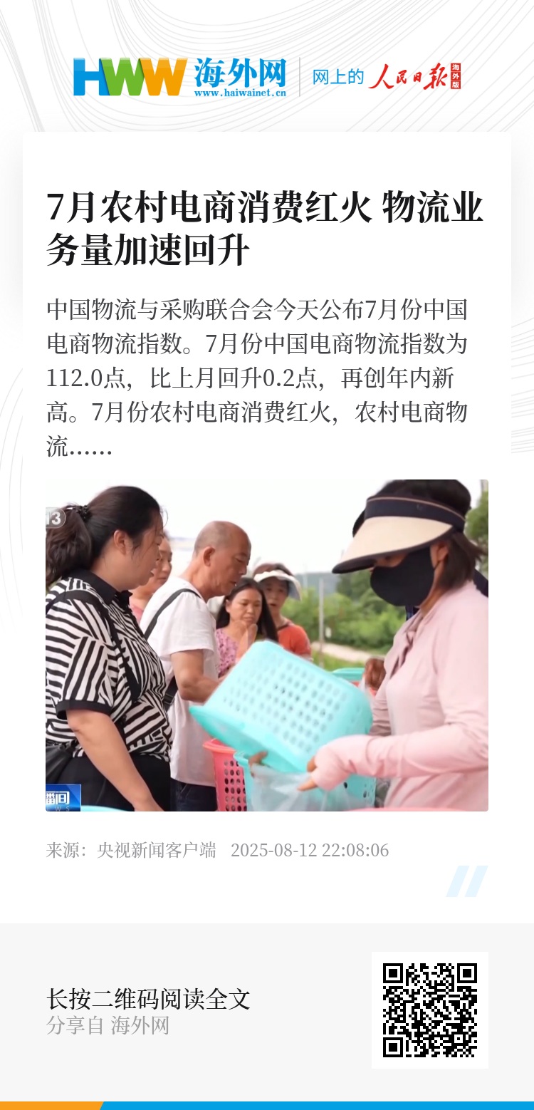 中国物流信息中心主任 刘宇航:在现代物流体系下,物流末端的服务网络持续地丰富。特别是我们看到这种信息化、科技化的手段不断介入之后,农村电商服务设施的供给能力越来越强,带动了农村电商板块销售的增长。