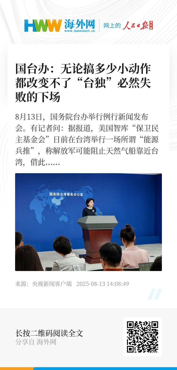 8月13日,国务院台办举行例行新闻发布会。有记者问:据报道,美国智库“保卫民主基金会”日前在台湾举行一场所谓“能源兵推”,称解放军可能阻止天然气船靠近台湾,借此断绝台湾的能源供应。对此发言人有何评论?