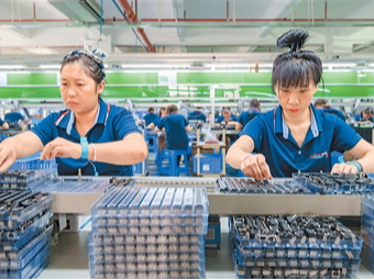 湖南省永州市冷水滩区持续优化营商环境,支持引导民营企业通过技术改造与数字化转型实现提质升级,推动民营经济高质量发展。图为该区一电子科技公司生产车间内,工人在生产线上赶制订单产品。雷中祥摄(人民视觉)