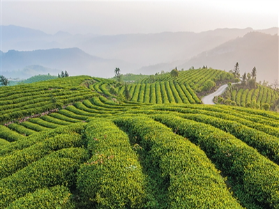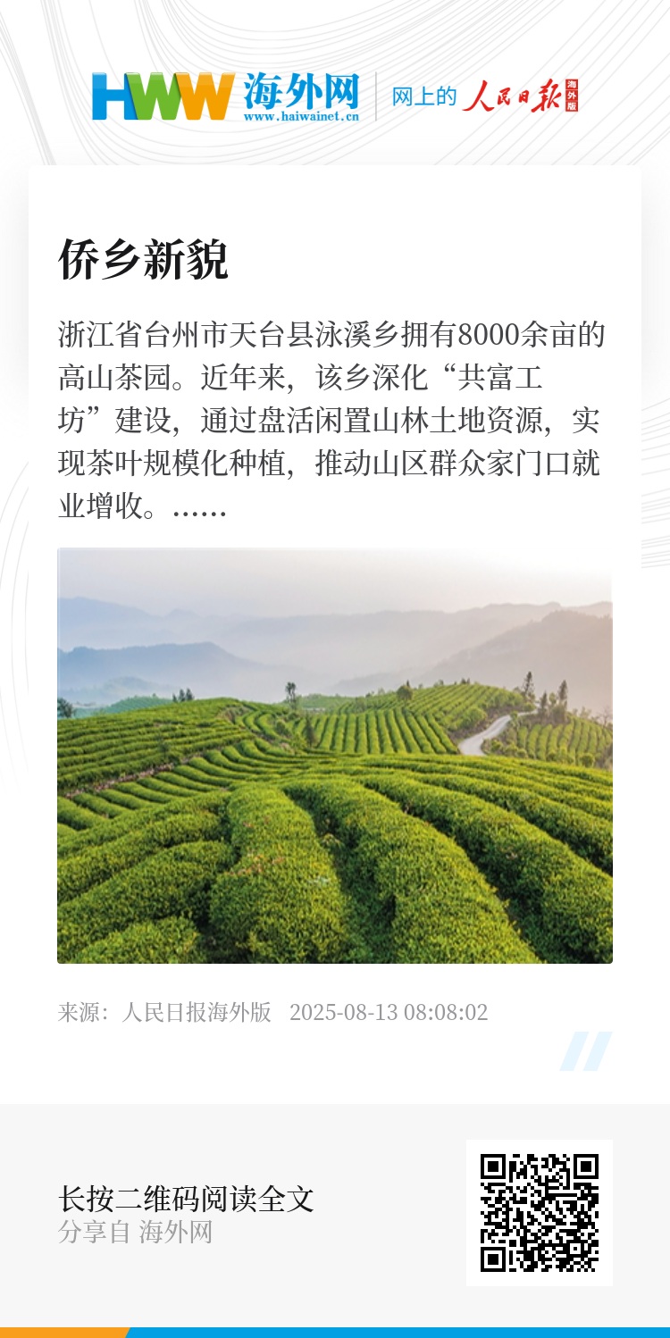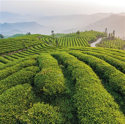 浙江省台州市天台县泳溪乡拥有8000余亩的高山茶园。近年来,该乡深化“共富工坊”建设,通过盘活闲置山林土地资源,实现茶叶规模化种植,推动山区群众家门口就业增收。图为泳溪乡大智村茶园。