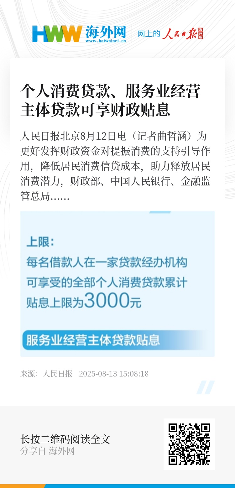 人民日报北京8月12日电(记者曲哲涵)为更好发挥财政资金对提振消费的支持引导作用,降低居民消费信贷成本,助力释放居民消费潜力,财政部、中国人民银行、金融监管总局近日联合印发《个人消费贷款财政贴息政策实施方案》,明确对个人消费贷款进行财政贴息。