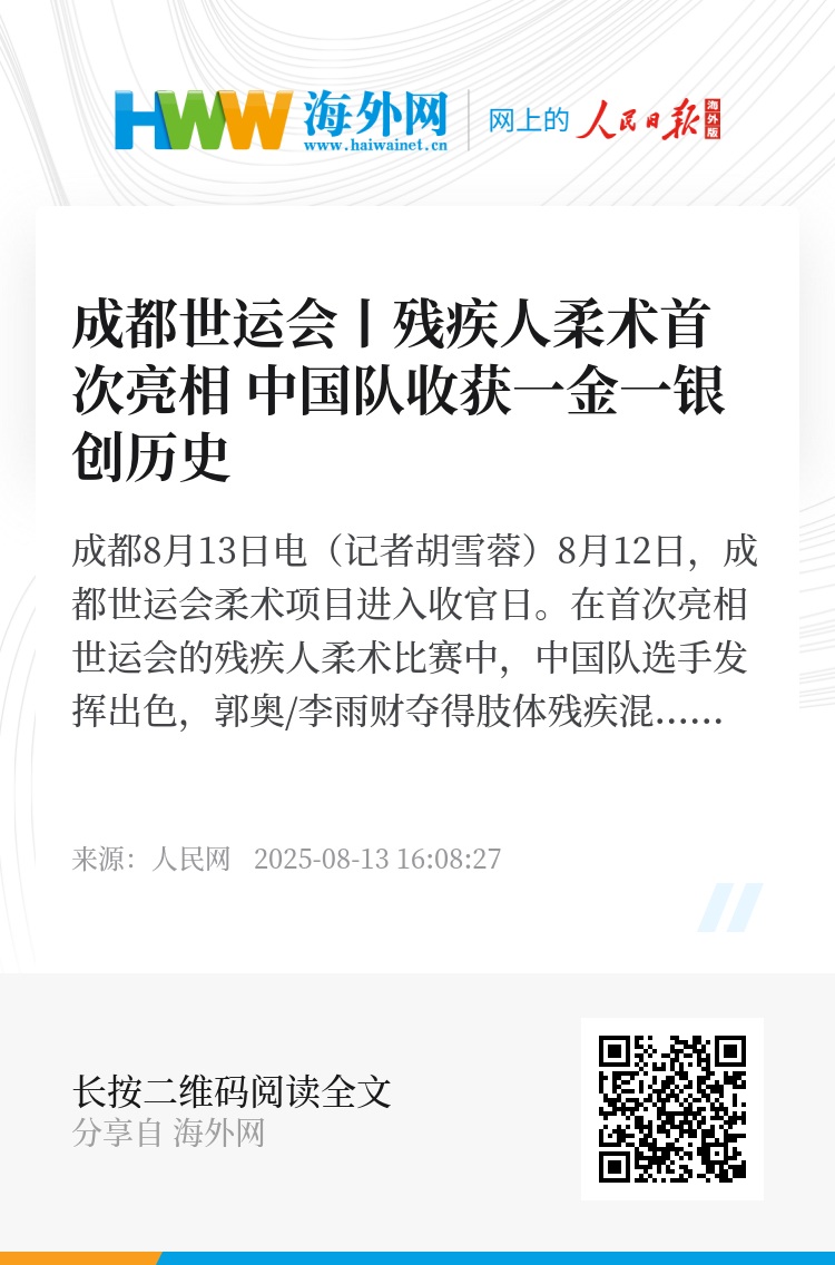 人民网成都8月13日电(记者胡雪蓉)8月12日,成都世运会柔术项目进入收官日。在首次亮相世运会的残疾人柔术比赛中,中国队选手发挥出色,郭奥/李雨财夺得肢体残疾混合双人金牌,潘天佑/王文强收获视力残疾混合双人银牌。
