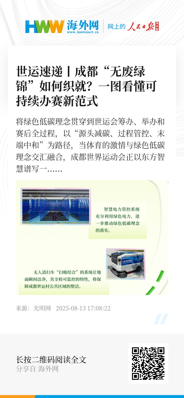 将绿色低碳理念贯穿到世运会筹办、举办和赛后全过程,以“源头减碳、过程管控、末端中和”为路径,当体育的激情与绿色低碳理念交汇融合,成都世界运动会正以东方智慧谱写一曲绿色环保的赛事赞歌。
