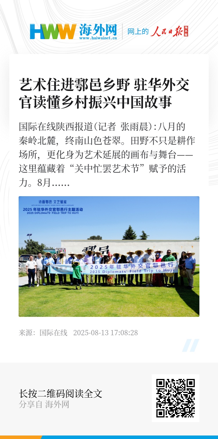 国际在线陕西报道(记者 张雨晨):八月的秦岭北麓,终南山色苍翠。田野不只是耕作场所,更化身为艺术延展的画布与舞台——这里蕴藏着“关中忙罢艺术节”赋予的活力。8月12日,来自20个国家的驻华外交官走进西安市鄠邑区,在艺术与乡土的奇妙交融中,开启了一场感知中国乡村振兴脉动的沉浸式旅程,亲身感受中国乡村振兴战略下,文化赋能带来的独特魅力。