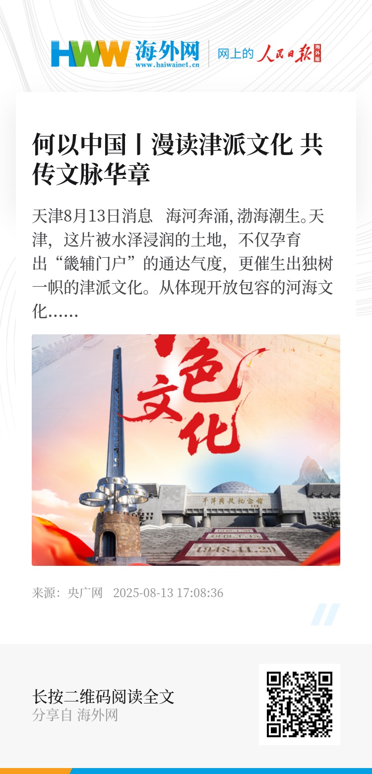 这些流淌在城市肌理中的文化印记,展现着天津的过往与当下、沉静与灵动。天津始终坚持“以文化人、以文惠民、以文润城、以文兴业”,以八大津派文化为根基,将其作为守护城市根脉、推动文化繁荣的核心抓手,着力打造“河海津韵”文化品牌,让历史文脉与时代精神同频共振。新征程上,海纳百川、多元包容的津派文化,正在为天津高质量发展提供强大动能,助力天津谱写建设中华民族现代文明的华彩新篇章。