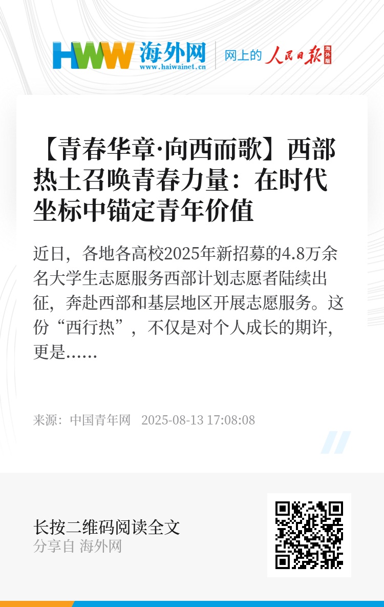 当前,西部地区不仅拥有广阔空间与丰富机遇,各地更不断完善政策支持体系:提升志愿者待遇、拓宽基层人才晋升通道、优化职业发展平台,积极营造“拴心留人”的环境。政策托底与个人价值实现的同向发力,使得“扎根西部”成为越来越多青年实现抱负的理性选择与自觉行动。