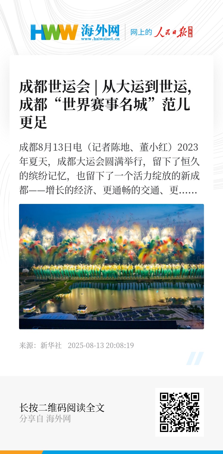 新华社成都8月13日电(记者陈地、董小红)2023年夏天,成都大运会圆满举行,留下了恒久的缤纷记忆,也留下了一个活力绽放的新成都——增长的经济、更通畅的交通、更美观的街景以及更加开放包容的人们……