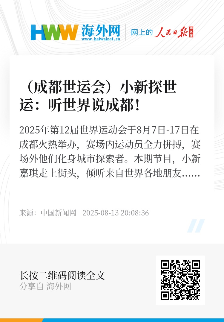 2025年第12届世界运动会于8月7日-17日在成都火热举办,赛场内运动员全力拼搏,赛场外他们化身城市探索者。本期节目,小新嘉琪走上街头,倾听来自世界各地朋友们的心声。(高嘉琪 邱川浩)