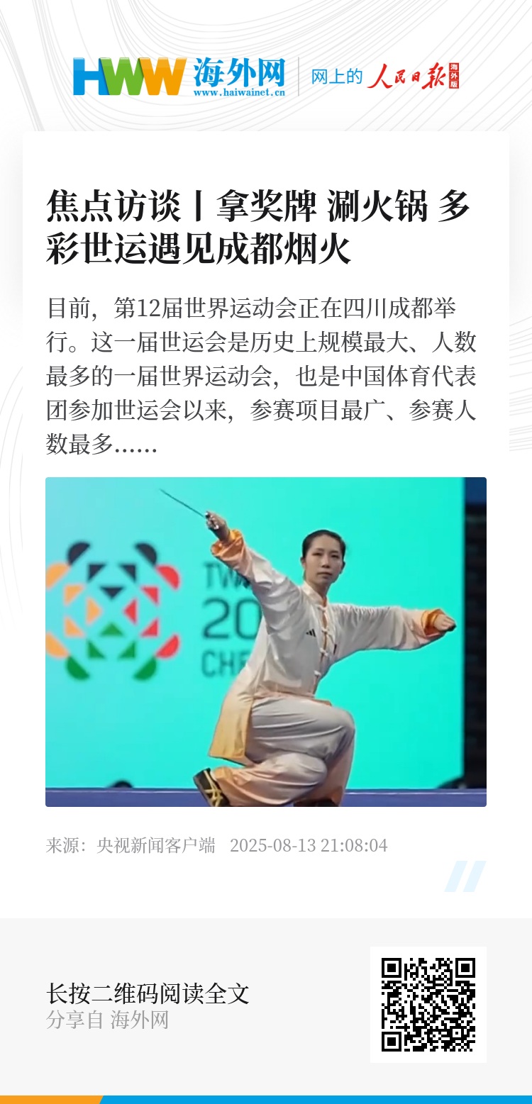 目前,第12届世界运动会正在四川成都举行。这一届世运会是历史上规模最大、人数最多的一届世界运动会,也是中国体育代表团参加世运会以来,参赛项目最广、参赛人数最多的一届。今天赛程已经过半。作为全球最高水平的非奥项目综合性体育盛会,成都世运会不仅以“运动无限、气象万千”的愿景吸引着世界目光,更以独特的城市魅力、新兴项目的创新活力和全民参与的热情,为这座城市注入了前所未有的激情。从赛场上的拼搏到运动场上的娱乐,从特许商品的火爆销售到文旅融合的热潮,成都正以一场“体育+城市”的盛宴,向世界展示着这座现代化都市的东方神韵。