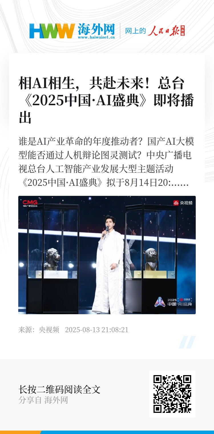 相AI相生,在上海共赴未来!总台《2025中国·AI盛典》拟于8月14日20:00档在总台央视综合频道(CCTV-1)、央视频新媒体矩阵播出,一起领略“相AI相生”的科技奇观!