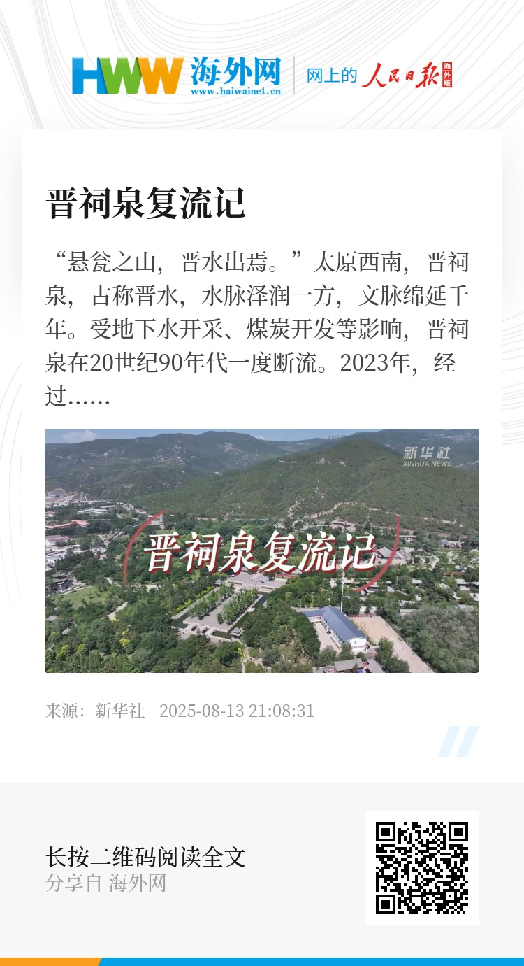 拥有19处岩溶大泉的山西有“华北水塔”之称。“晋祠泉复流得来不易,振奋人心。”山西省水利厅水文水资源管理处处长张天锋说,“这是山西乃至华北地区地下水治理和泉域保护的重要成果,也是新时代山西治水兴水节水和生态建设的生动实践。”