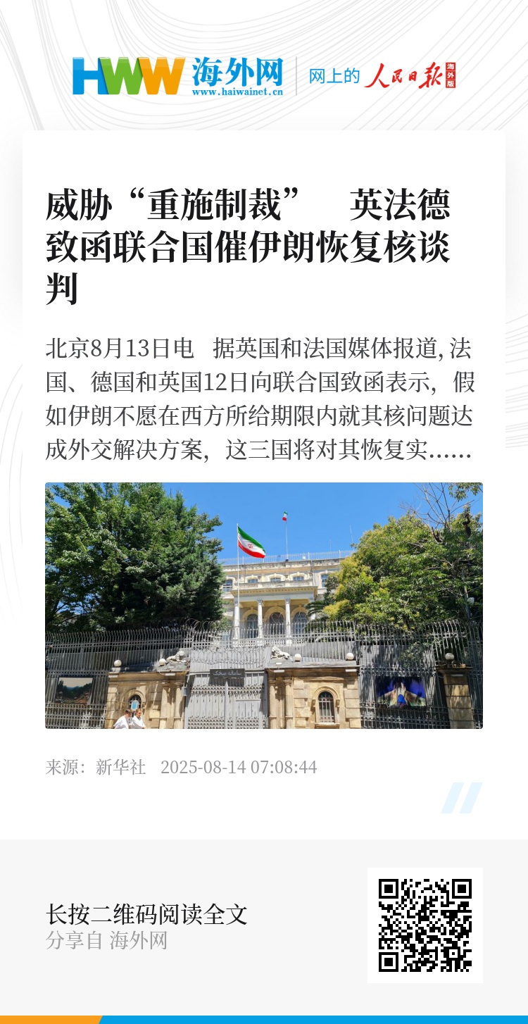 英国《金融时报》12日报道,英法德三国外长当天向联合国秘书长古特雷斯和联合国安理会联名致函,其中写道:“我们已表明立场,若伊朗不愿在2025年8月底前达成外交解决方案,或不抓住最后的延期机会,欧洲三国准备启动快速恢复制裁机制。”