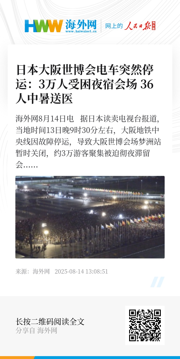 海外网8月14日电 据日本读卖电视台报道,当地时间13日晚9时30分左右,大阪地铁中央线因故障停运,导致大阪世博会场梦洲站暂时关闭,约3万游客聚集被迫彻夜滞留会场。