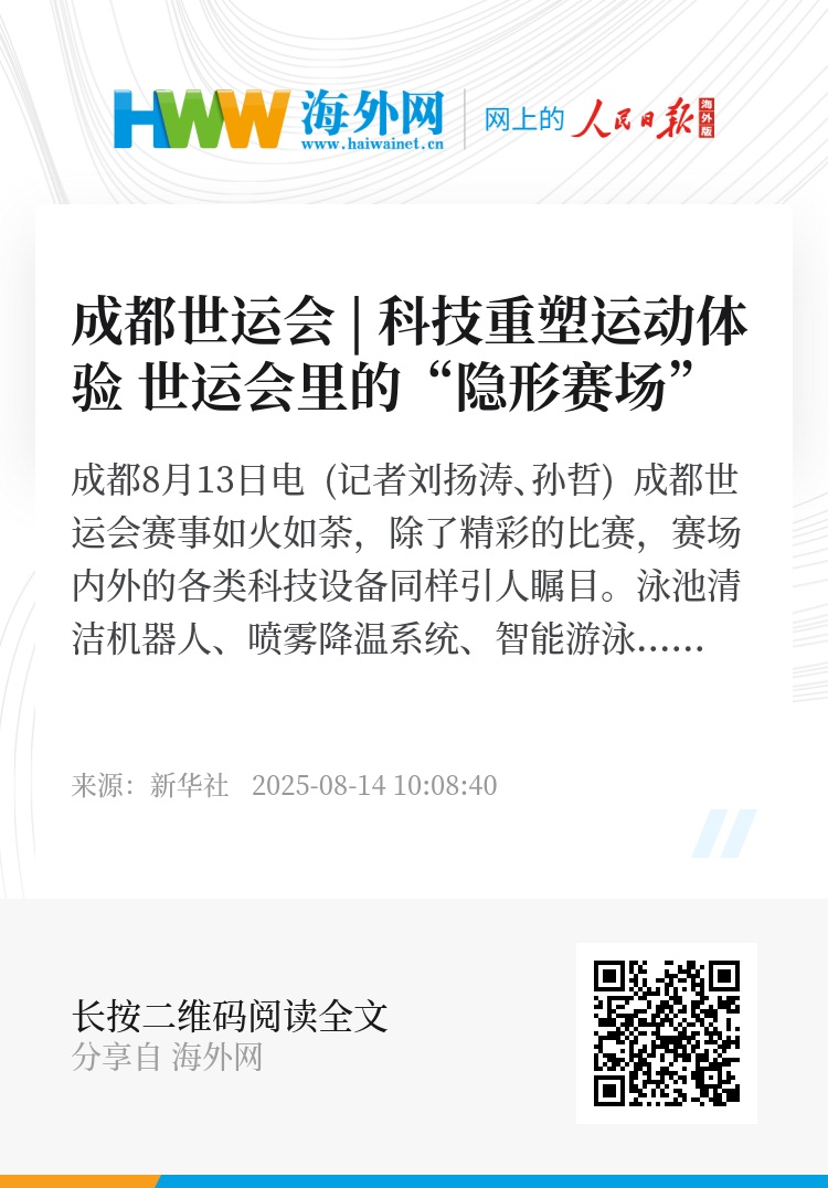 新华社成都8月13日电 (记者刘扬涛、孙哲) 成都世运会赛事如火如荼,除了精彩的比赛,赛场内外的各类科技设备同样引人瞩目。泳池清洁机器人、喷雾降温系统、智能游泳出发台……在赛事保障服务的“隐形赛场”上,科技正在重塑运动体验。
