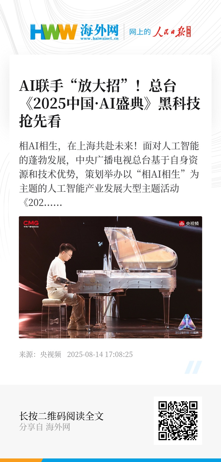 人工智能是年轻的事业,也是年轻人的事业。在汇聚超百项AI创新技术,集结全球AI科学家、艺术家共创的《2025中国·AI盛典》,机器人不再是冰冷的机械,而是能歌善舞的艺术家;AI不再只是工具,而是拥有“灵魂”的思考者;文物不再囿于时空,而是跨越国界的文化使者。8月14日20:00档,《2025中国·AI盛典》将在总台央视综合频道(CCTV-1)、央视频播出,邀您一睹人机共创的视听奇观,赴一场“相AI相生”的未来之约!