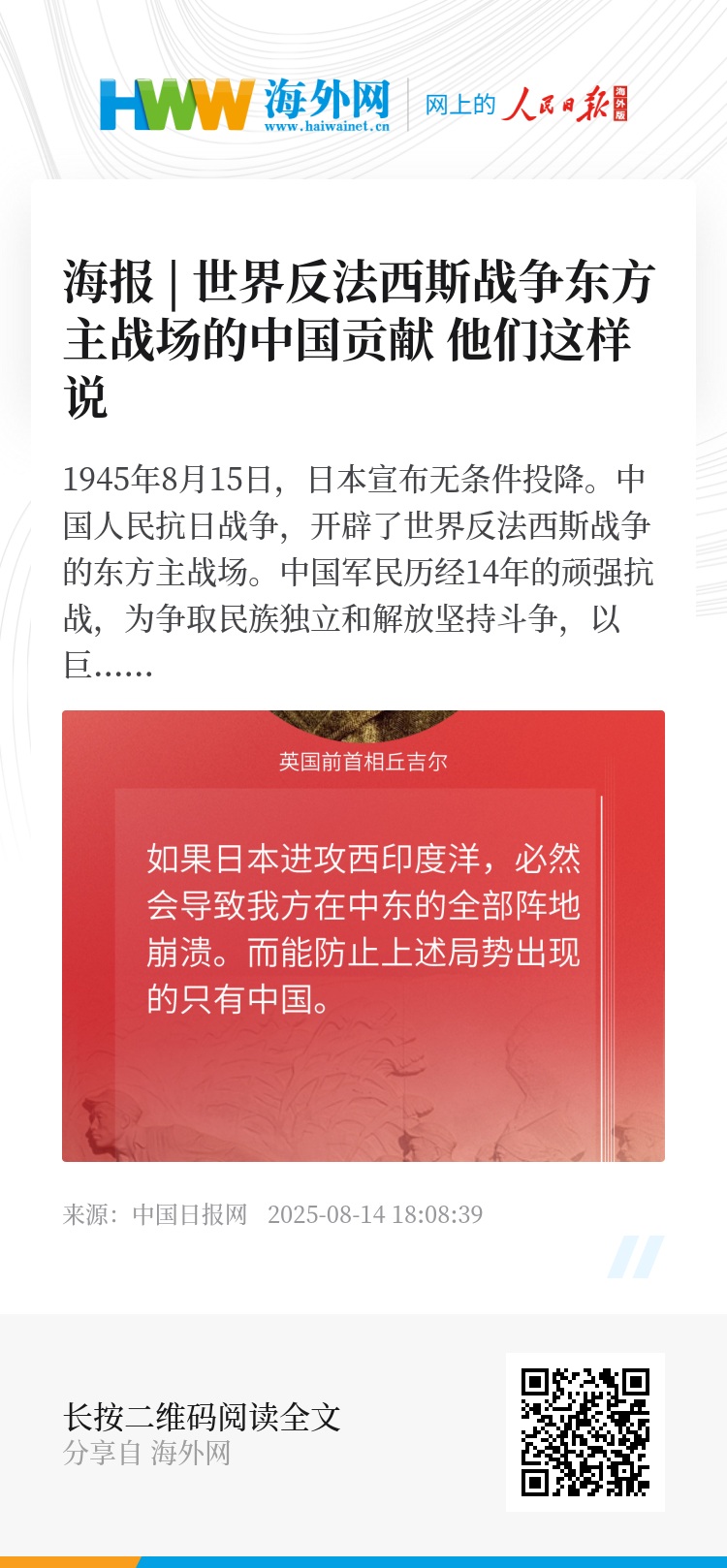 1945年8月15日,日本宣布无条件投降。中国人民抗日战争,开辟了世界反法西斯战争的东方主战场。中国军民历经14年的顽强抗战,为争取民族独立和解放坚持斗争,以巨大的牺牲承担国际责任,赢得了世界尊重和大国尊严。